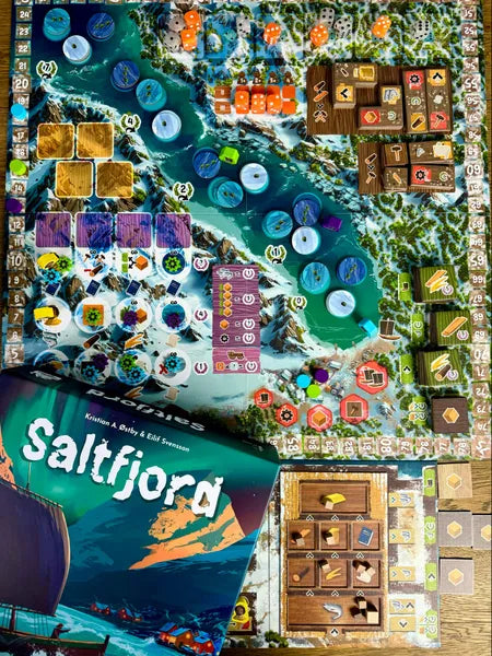 In Saltfjord (Aporta Games, ideato da Kristian Amundsen Østby ed Eilif Svensson), assumi il ruolo di leader di un villaggio di pescatori norvegese alla fine dell'Ottocento. Un gioco da tavolo strategico per 1-4 giocatori, che combina piazzamento tessere, gestione risorse e meccaniche di dadi per sviluppare edifici, commerciare e innovare. La variabilità del setup e le abilità speciali garantiscono un'elevata rigiocabilità e profondità tattica.