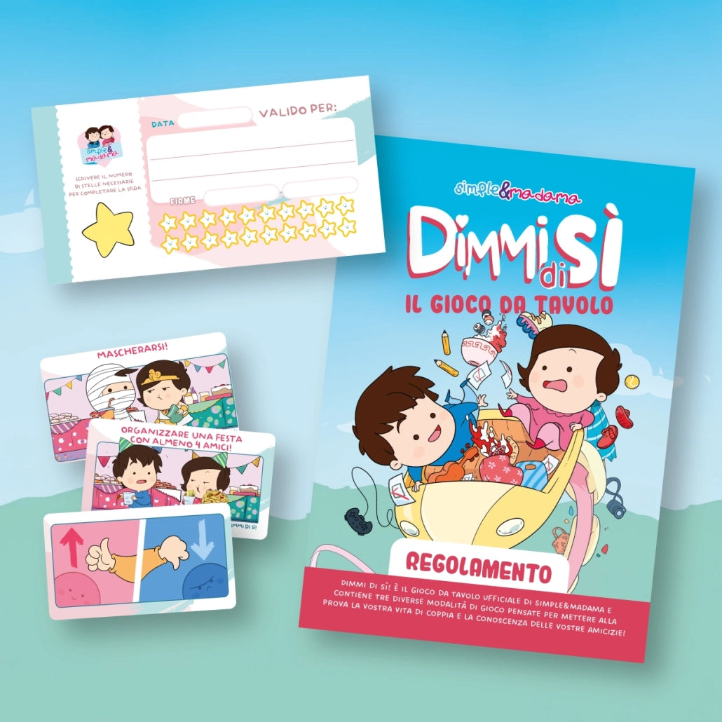 Pubblicato da MS Edizioni, Simple&Madama – Dimmi di Sì è un gioco da tavolo per 2-8 giocatori, dai 8 anni in su, con partite di circa 15-40 minuti. Creato da Lorenza Di Sepio e Marco Barretta, con la collaborazione di Christian Giove, il gioco si basa sull'universo di Simple&Madama, trasformando le dinamiche di coppia e le relazioni tra amici in un'esperienza divertente e sorprendente. Con tre modalità di gioco—Per Coppie, Quanto mi conosci? e Tempo di Regali—i partecipanti esploreranno quanto conoscono davvero l'altra persona, creando momenti di risate, riflessione e complicità.