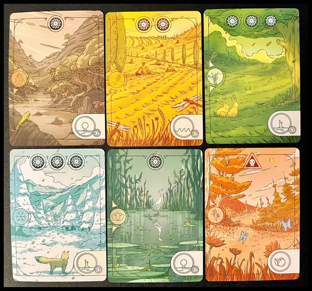 Ogni round scegli una carta da un display comune. La carta ti dice in quale bioma puoi agire (es. tundra, foresta, deserto…) e ti offre un’azione extra. Ma attenzione: le carte che lasci agli altri influenzano la fertilità futura delle regioni!