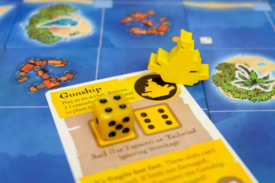 La mappa è modulare e si costruisce esplorando il mare: ogni partita è diversa, piena di correnti, relitti e zone contese. Le meccaniche includono piazzamento tessere, controllo area e pick-up & deliver, con un sistema di lavoratori su dadi molto elegante.