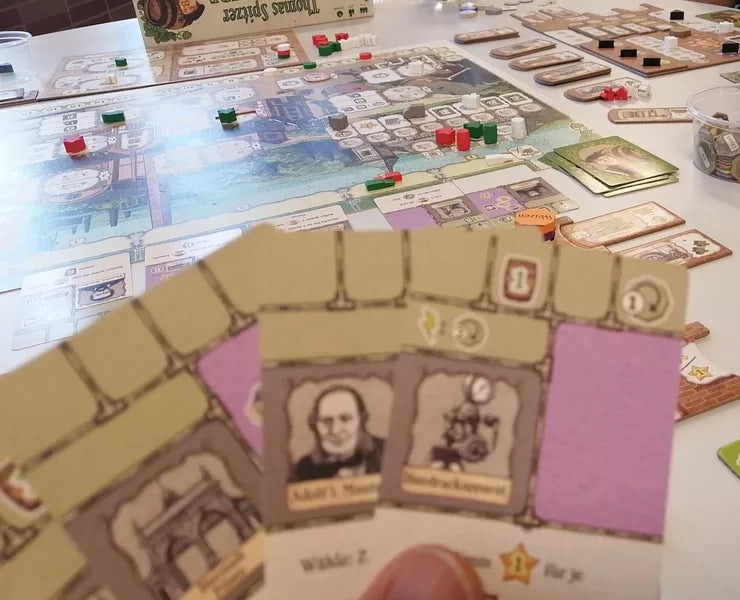 Ogni turno richiede piazzamento lavoratori tattico, gestione della mano, e un occhio sempre puntato sull’efficienza: ottenere lavoratori bonus o giocare carte al momento giusto può fare la differenza.
