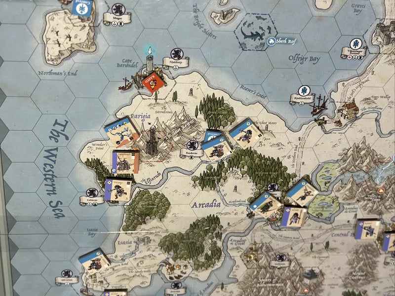 Le tue unità si spostano su grandi esagoni illustrati con cura, rappresentando mari, montagne e terre di Kheros. La logistica è tanto importante quanto la forza militare: marciare al momento giusto può decidere la guerra.