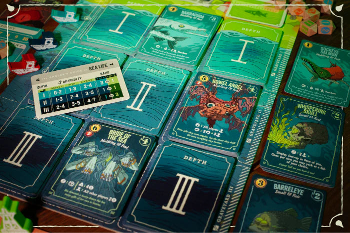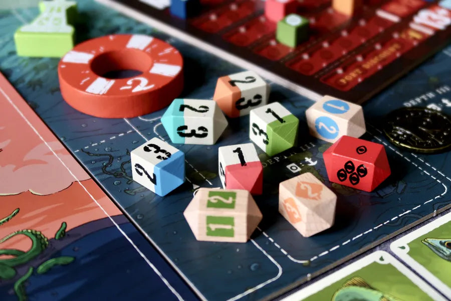 3 La pesca avviene a tre profondità diverse: ogni livello offre creature più preziose ma anche più pericolose, con meccaniche di push-your-luck e gestione dei dadi.