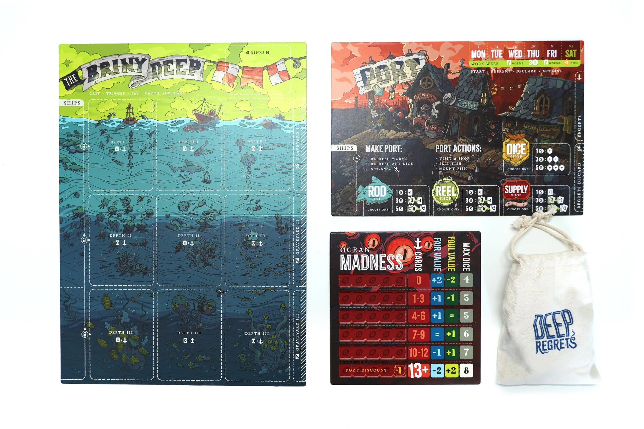 Creato da Tettix Games, Deep Regrets è un gioco da tavolo strategico ed esplorativo per veri avventurieri del mare... e dell’anima. In un mondo dove ogni battuta di pesca può portare fortuna o follia, dovrai decidere cosa pescare, cosa vendere, cosa tenere e quando tornare al porto, prima che l’oscurità ti inghiotta.