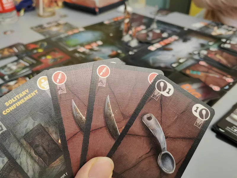 Puoi ottenere strumenti costruendoli con materiali di fortuna, comprandoli con sigarette o… rubandoli agli altri detenuti. Ogni turno è un equilibrio tra bluff, gestione delle risorse e interazione diretta, mentre le carte Background e Gang aggiungono poteri unici e colpi di scena letali.