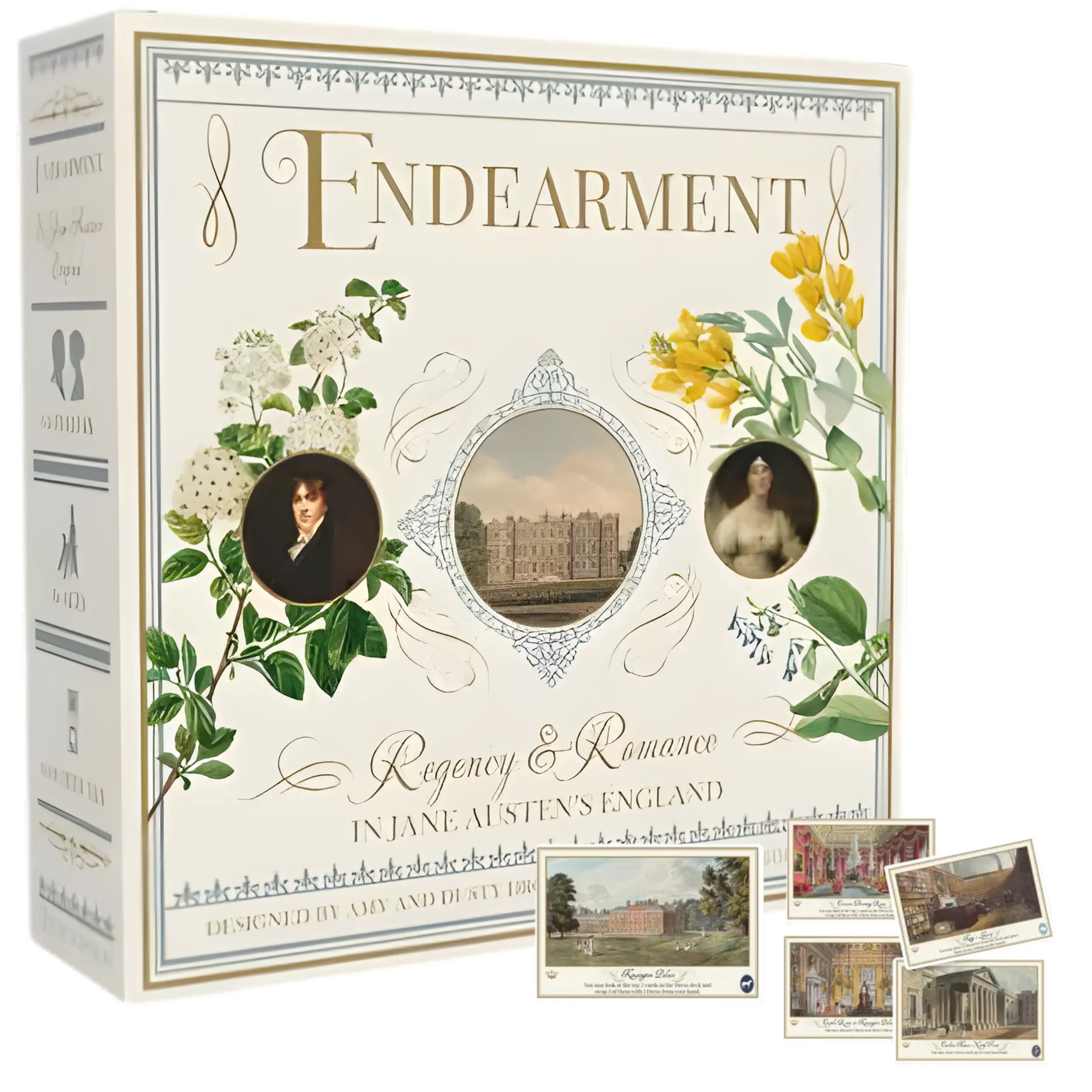 Endearment è un gioco da tavolo narrativo e strategico per 1–4 giocatori, ambientato nell’Inghilterra Regency e pubblicato da Dux Somnium Games. Ispirato ai romanzi di Jane Austen, ti trasporta tra salotti eleganti, tè pomeridiani e balli scintillanti, dove la reputazione conta più dell’oro. Ogni giocatore interpreta una giovane eroina alla ricerca di amore, prestigio e riconoscimento sociale, pianificando azioni, abiti e relazioni come in un vero romanzo. Diviso in Capitoli, alterna momenti di pianificazione a incontri sociali e decisioni che cambieranno per sempre la tua storia. E, come sempre accade nei romanzi di Austen, tutto culmina in un matrimonio — solo il cuore più brillante conquisterà la vittoria.