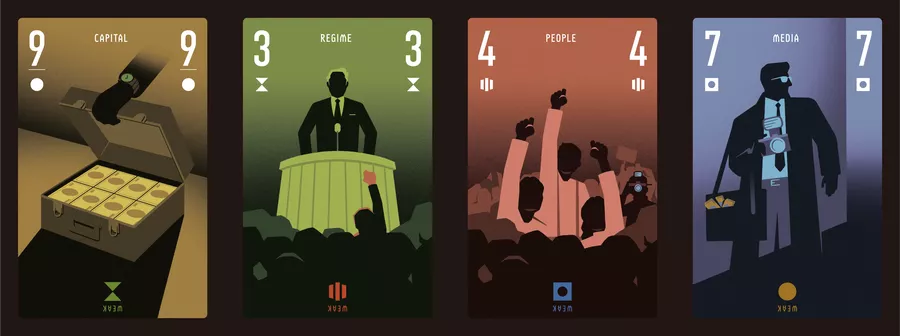 Ogni giocatore ha un mazzo di carte divise in quattro semi: Regime, Capitale, Media e Popolo. A turno si piazzano carte in diverse aree di conflitto, creando tensioni tra fazioni rivali.