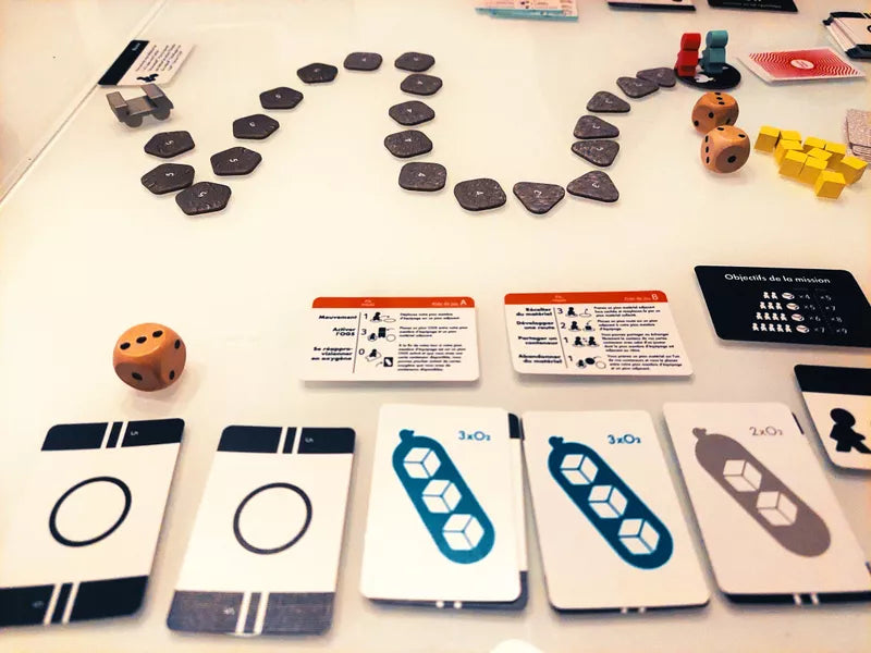 Il gioco è completamente cooperativo: tutti vincono o tutti perdono. Ogni decisione va condivisa, dal percorso da seguire alle risorse da prendere, cercando di sfruttare al meglio l’ossigeno comune e il movimento limitato di ogni turno.