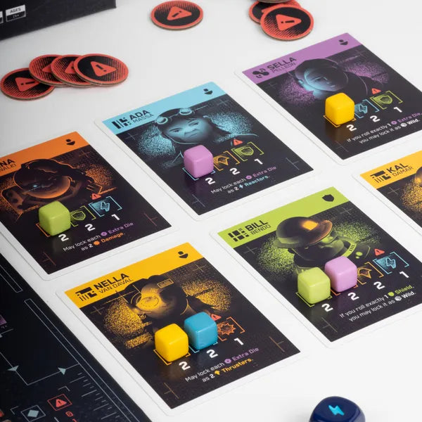 Il motore di Moonrollers è la sua meccanica di push-your-luck combinata con gestione dei dadi. Ogni turno offre ai giocatori la possibilità di assegnare i dadi a carte missione per guadagnare punti, abilità e membri dell’equipaggio, ma con un twist: più rilanci, più rischi di “bustare” e perdere tutto. Le missioni completate forniscono potenziamenti che rendono i turni successivi più vantaggiosi, creando un sistema di crescita costante ma precario. La tensione nasce dal ritmo alternato tra controllo e rischio: fermarsi al momento giusto è difficile quanto osare un lancio in più. Il risultato è un flusso di gioco rapido, emozionante e pieno di decisioni istintive che trasformano ogni partita in un piccolo viaggio tra astuzia e fortuna.