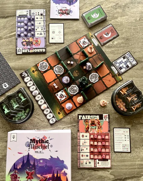 Mythic Mischief Vol. II è un gioco da tavolo astratto e strategico, standalone ma compatibile con il primo volume, per 1-4 giocatori.