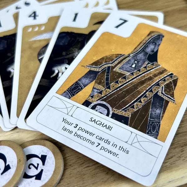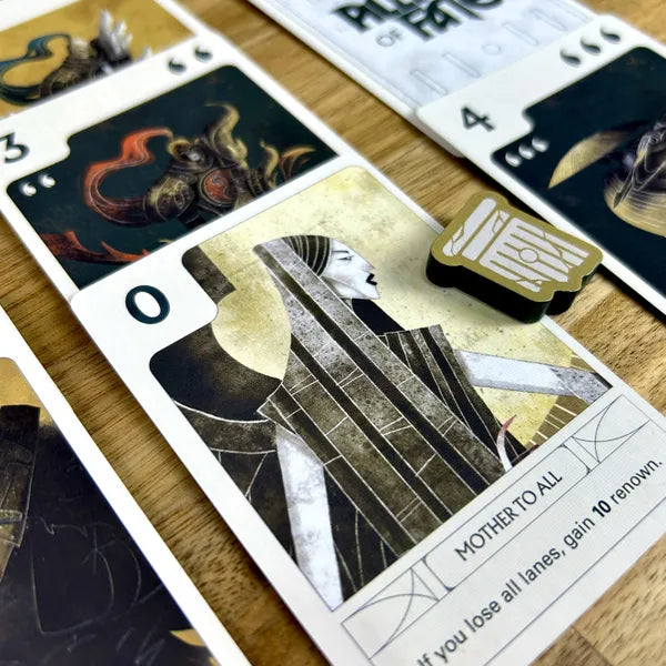 Il cuore di Pillars of Fate è il suo sistema a tre corsie di conflitto, dove le carte determinano l’esito di ogni missione. Ogni giocatore gioca tre carte per corsia, una delle quali viene posizionata a faccia in giù, creando un equilibrio perfetto tra informazione parziale e deduzione reciproca. Il risultato di ciascuna missione dipende dai semi e dai valori delle carte, ma anche dal tempismo dei poteri divini, capaci di invertire alleanze, ribaltare esiti o manipolare i punteggi. Questa combinazione di visibile e nascosto genera una tensione psicologica costante, dove la vittoria nasce non solo dalle carte giuste, ma dal controllo della percezione dell’altro. Ogni round diventa così una mini-partita di bluff, intuizione e coraggio calcolato: un duello elegante che vive di silenzi e sguardi più che di fortuna.