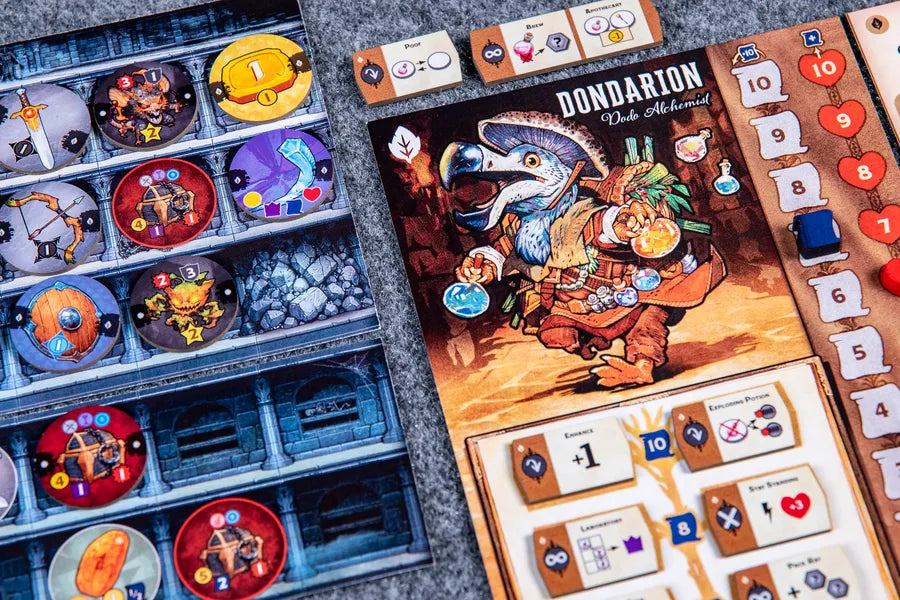 Una volta completato il dungeon, risolvi gli effetti di ogni pedina: le pozioni curano, i forzieri ricompensano (ma possono nascondere trappole), i mostri infliggono danni ma offrono oro, XP e punti vittoria se sconfitti. Armi, scudi e artefatti ti permettono di cambiare le sorti dello scontro.
