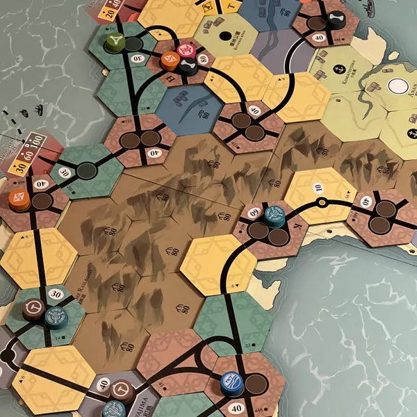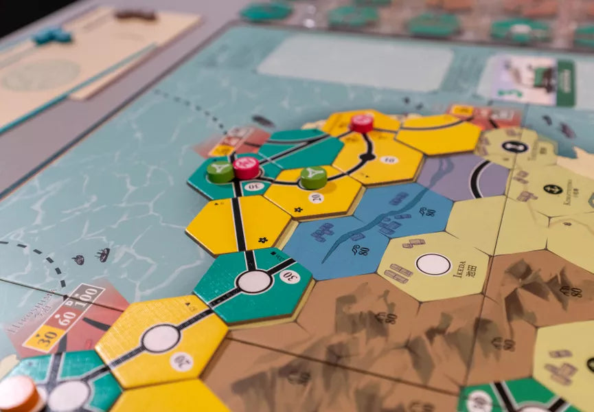 Durante il turno della compagnia, costruisci tratte ferroviarie posizionando tessere su mappa esagonale. L’obiettivo è collegare città redditizie, migliorare il valore delle tratte e aprire nuove opportunità di profitto.