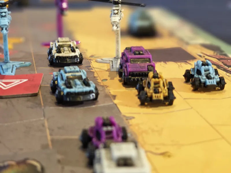 Prepara la tua squadra e scendi in pista: dovrai lanciare dadi, muovere i tuoi veicoli, sparare e sperare di non finire distrutto. Ogni turno ti offre decisioni cruciali grazie al pannello comandi, dove potrai riparare danni, attivare il nitro o attaccare con l’elicottero d’assalto!