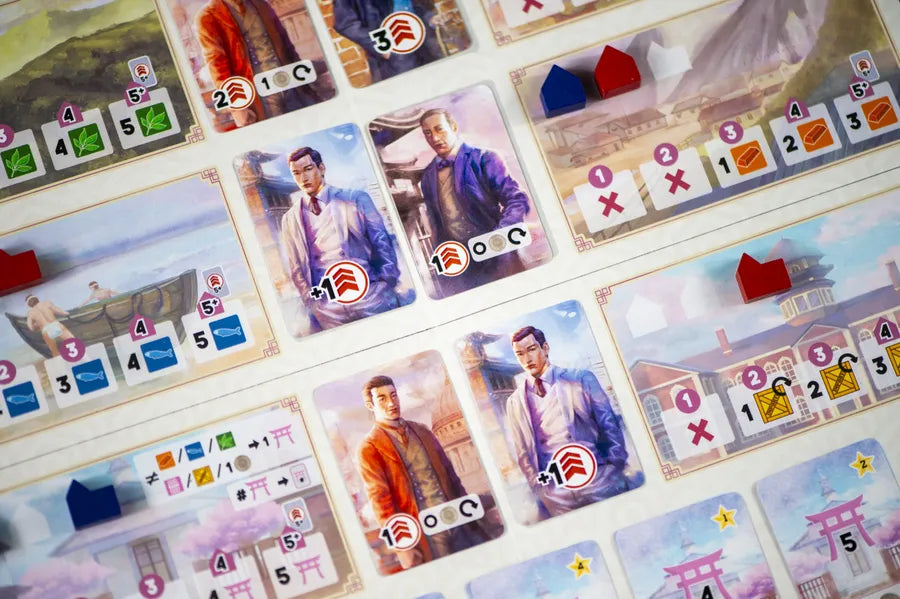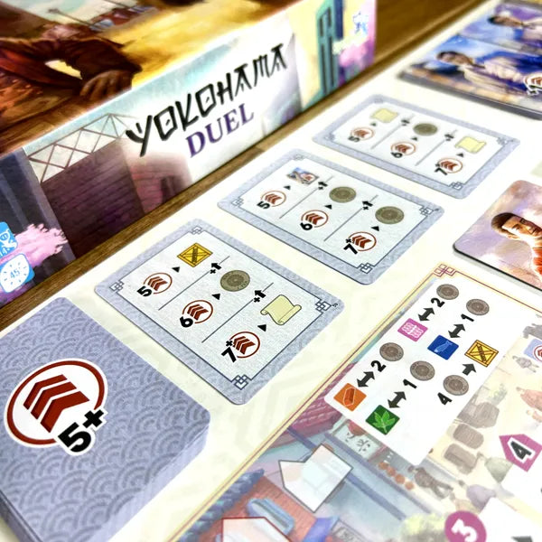 In Yokohama Duel due giocatori si sfidano per dominare il commercio in una città in rapida trasformazione, dove tradizione e modernità si intrecciano e ogni scelta può portare prestigio o fallimento.