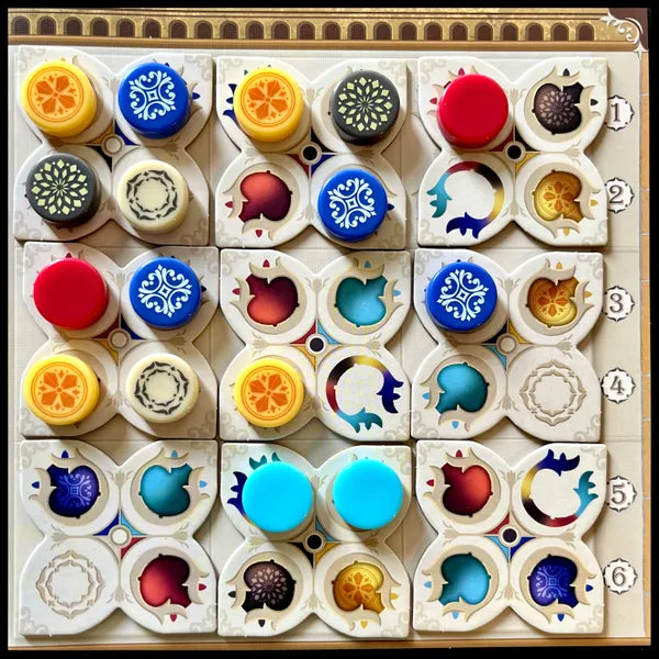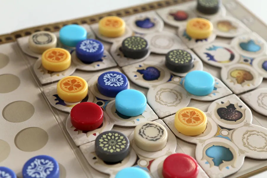 1 Ogni round i giocatori scelgono tessere da un’offerta comune e le piazzano sulla propria plancia seguendo le regole di posizionamento dei colori e degli schemi.