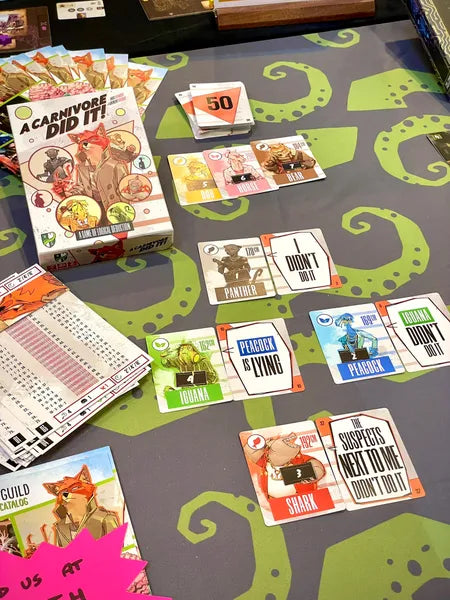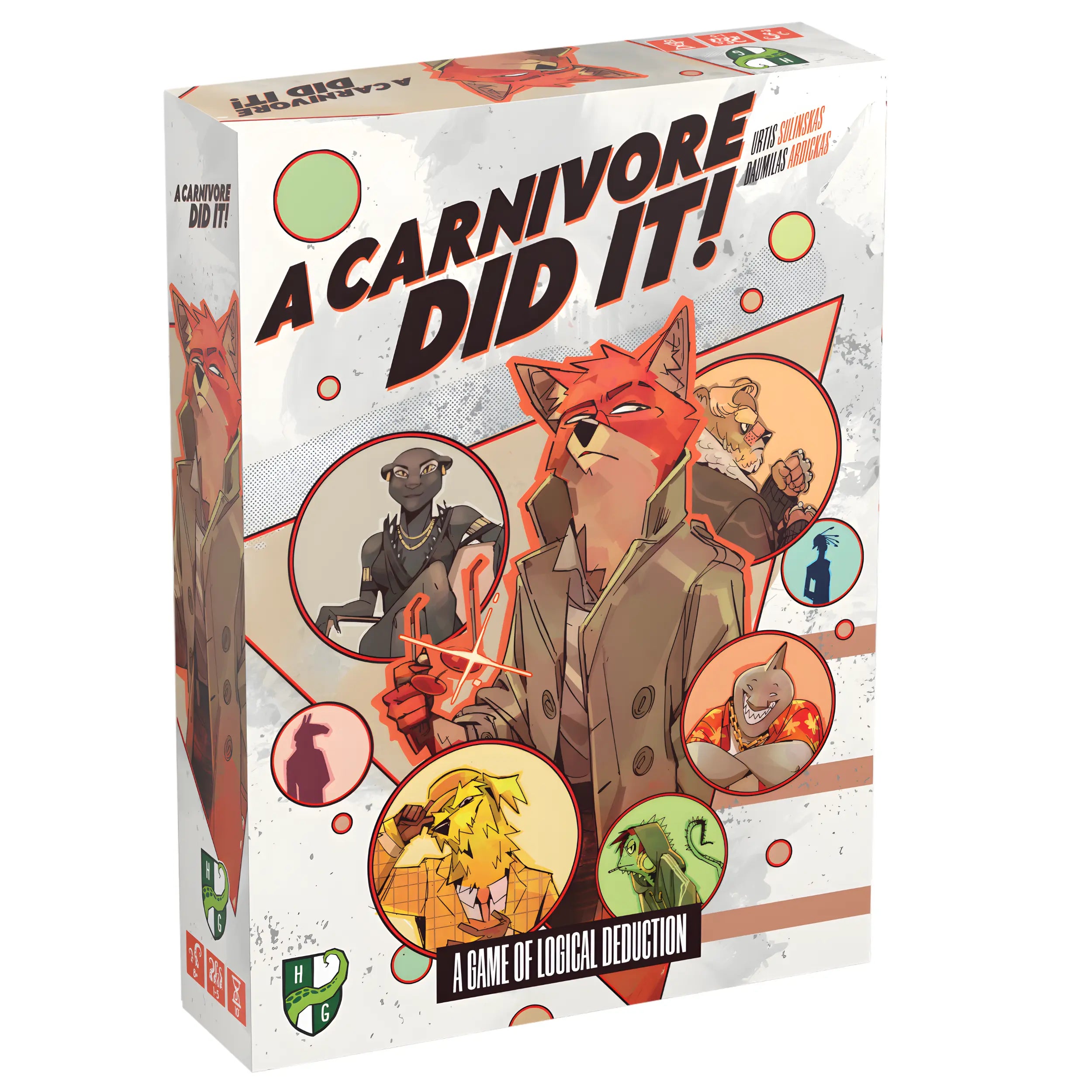 A Carnivore Did It! è un gioco da tavolo deduttivo e cooperativo per 1–5 giocatori, ideato da Daumilas Ardickas e Urtis Šulinskas e pubblicato da Horrible Guild. Ogni partita è un enigma logico con animali sospettati di un “delitto” metaforico: tra carnivori, erbivori e bugiardi, dovrai capire chi mente e chi dice la verità per risolvere il caso.