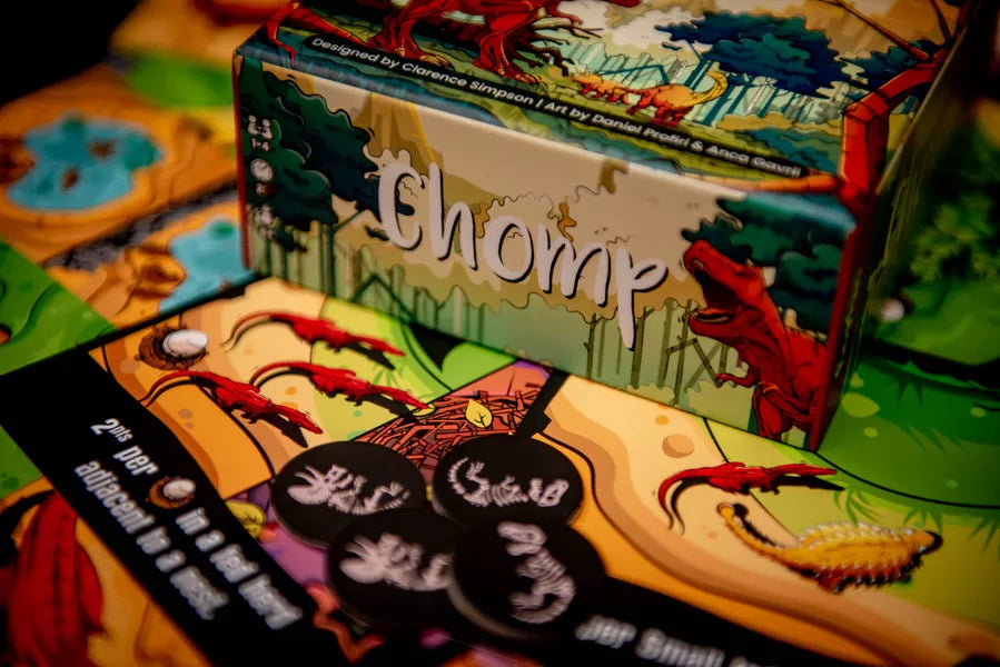 Chomp è un gioco da tavolo astratto e ambientato nel mondo dei dinosauri, pensato per 1-4 giocatori e adatto a famiglie e gamer occasionali.