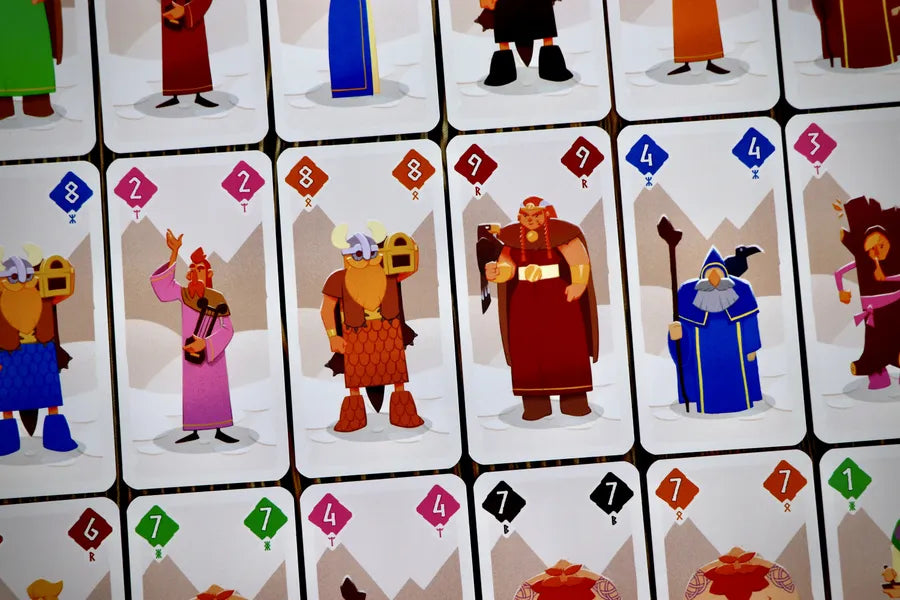 In Odin, il tuo obiettivo è mandare tutti i tuoi Vichinghi in missione… ovvero giocare tutte le carte dalla tua mano prima degli avversari. Il mazzo ha sei semi numerati dall’1 al 9, e ogni giocatore inizia con nove carte.