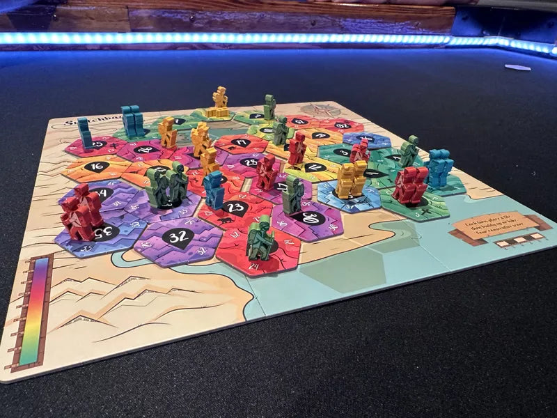 Ogni turno prevede la scelta e il piazzamento di una tessera numerata da 1 a 37 su una mappa esagonale condivisa, con l’obiettivo di costruire sequenze numeriche adiacenti. Se riesci a farlo, puoi posizionare un tuo segnalino su quelle tessere e accumulare punti.