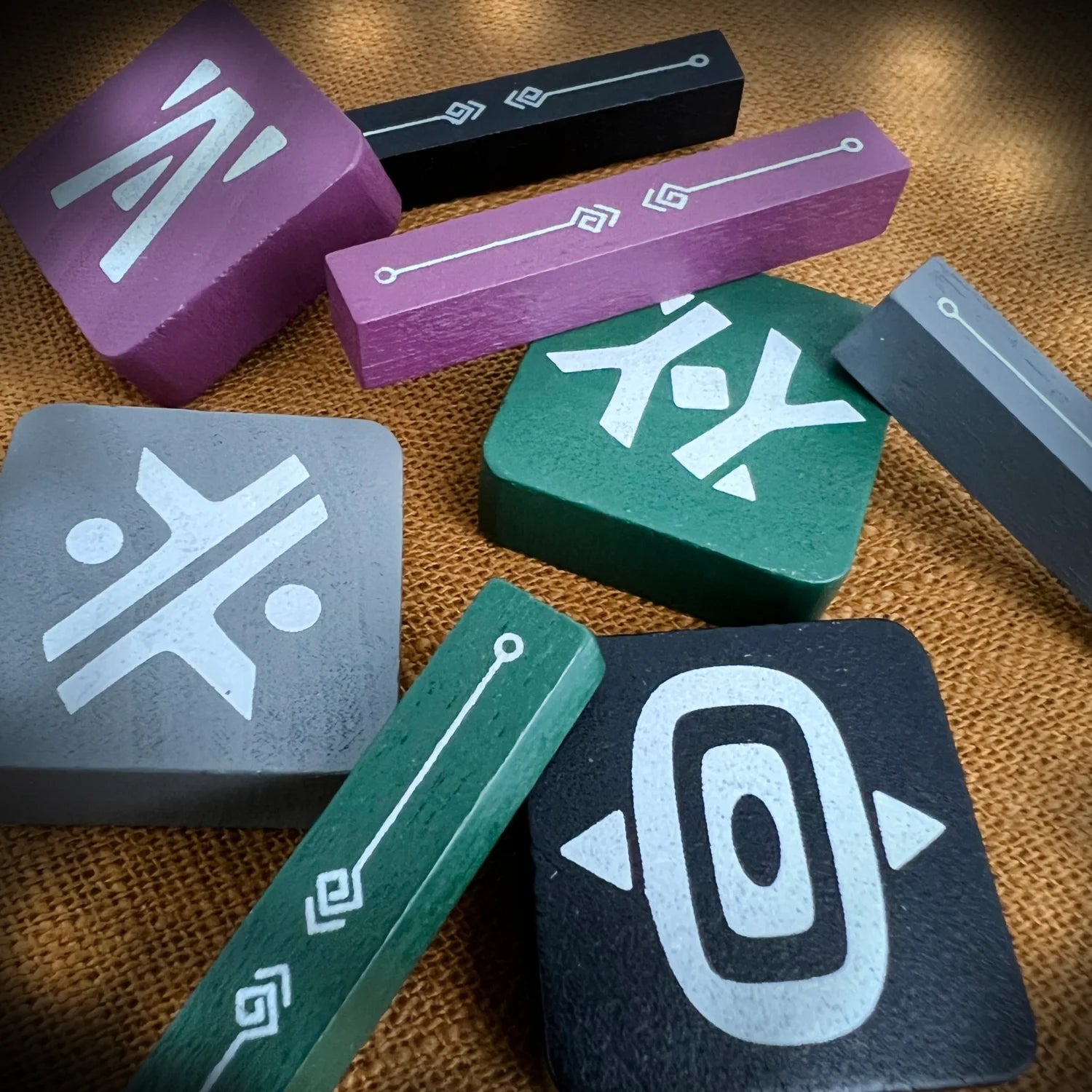 11 Tessere Artefatto, 1 Sagoma Caverna, 28 Carte, 4 Indicatori Quadrati, 4 Indicatori Rifugio, 4 Aiuti Giocatore, 4 Tessere Slot Aggiuntivo, 1 Regolamento.