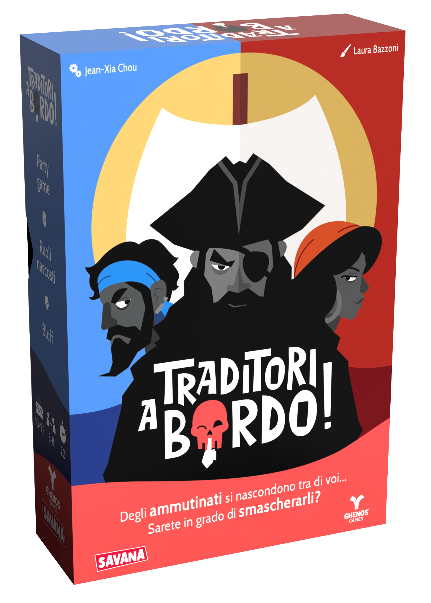 Traditori a Bordo! è un gioco da tavolo party per 3-8 giocatori, perfetto per serate tra amici, dove la tensione psicologica fa da padrona.