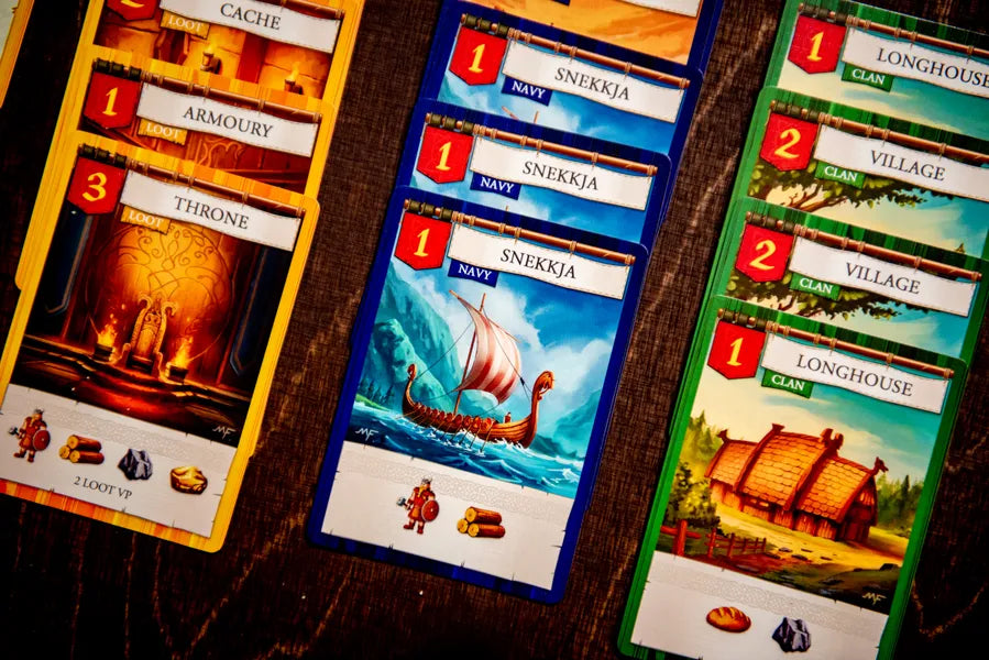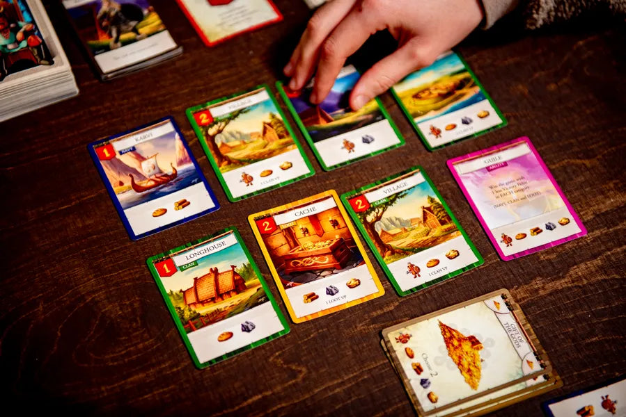 Pesca due carte e scopri cos'ha combinato il tuo clan mentre eri via: magari ha trovato oro, reclutato berserker, o guadagnato il favore di una divinità. Potrai poi compiere un’azione e acquistare un oggetto dal mercato centrale, scegliendo tra navi, edifici o tesori. Ogni oggetto porta punti vittoria, ma vincere richiederà equilibrio tra potenza militare, ricchezza e costruzione del tuo villaggio. Un gioco di strategia leggero ma frizzante, perfetto per famiglie e gruppi di giocatori casual che vogliono una serata tra rune, razzie e risate. Occhio però a Ragnarok...