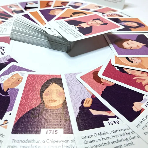 In questo gioco da tavolo per famiglie (ma perfetto anche in solitario), il tuo obiettivo è disporre in ordine cronologico 7 donne che hanno cambiato il corso della storia. Puoi osare con mosse più rischiose per guadagnare terreno, o giocare con cautela per non perdere carte preziose. E in mezzo a loro ci sono anche le donne anonime, jolly potenti che ricordano chi ha lottato senza essere ricordata.