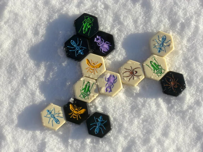 Si gioca senza plancia: ogni pedina è un insetto con un tipo di movimento unico, e l’obiettivo è circondare completamente l’ape regina avversaria.