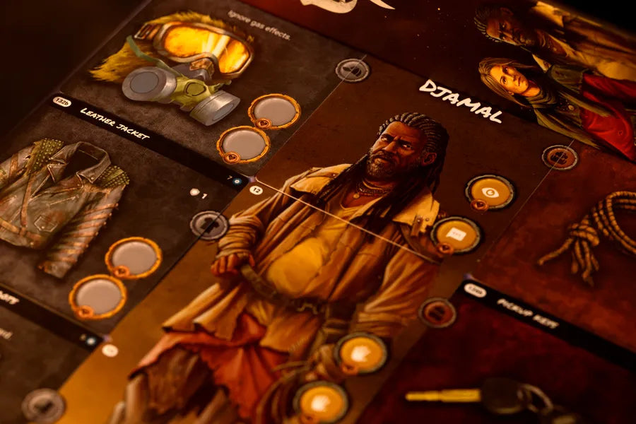 Il tabellone si compone di carte terreno ed elementi narrativi che si rivelano e si trasformano durante la partita. Alcuni eventi fanno comparire nuovi luoghi, nemici o alleati, mentre l’equipaggiamento ottenuto permette di sbloccare abilità aggiuntive o combinazioni strategiche per sopravvivere.