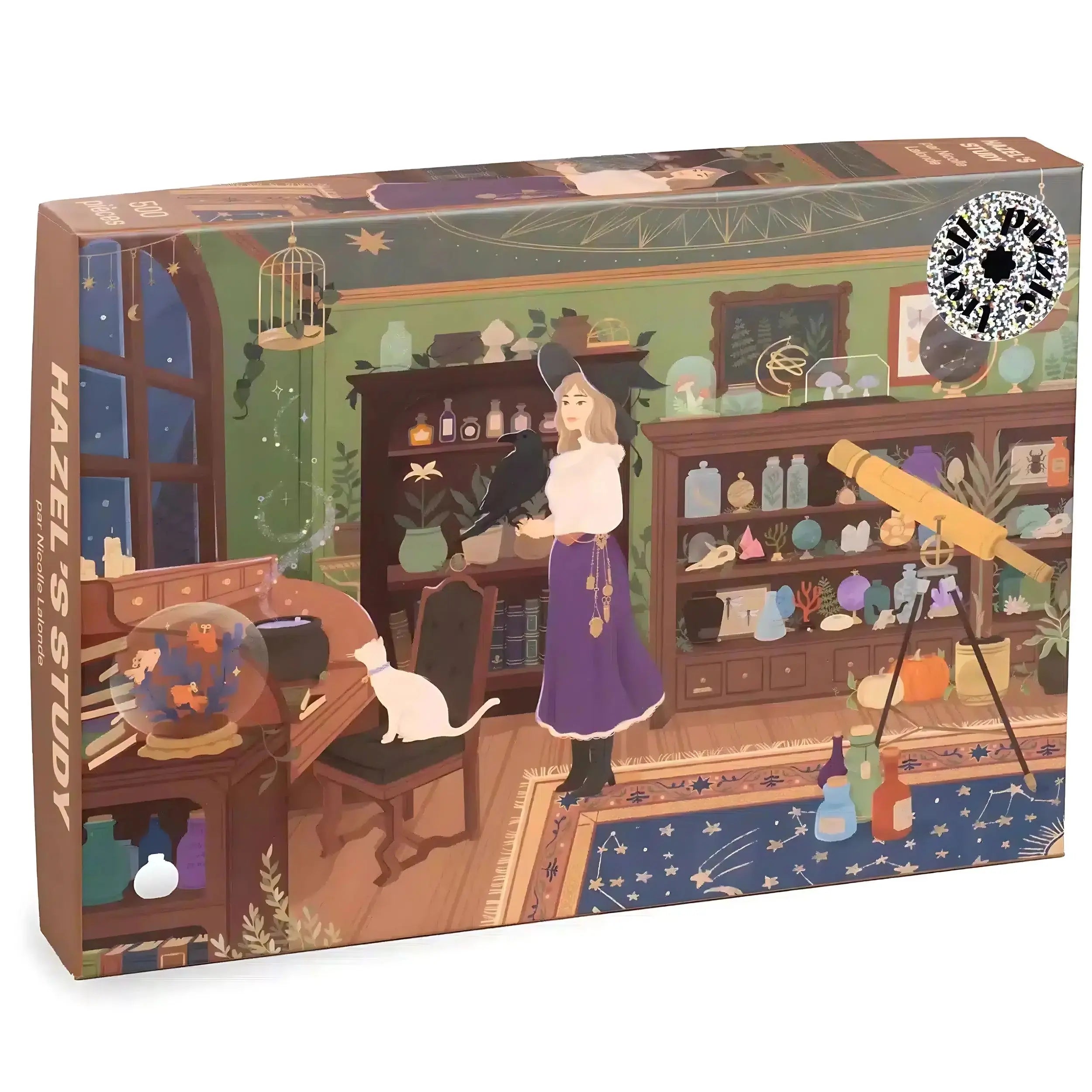Hazel’s Study è un puzzle da 500 pezzi illustrato da Nicolle Lalonde, artista canadese specializzata nel trasformare angoli domestici in piccoli mondi incantati. In questa scena ti apre le porte del laboratorio di Hazel, una strega gentile circondata da libri, pozioni, misteri... e ovviamente un gatto nero.