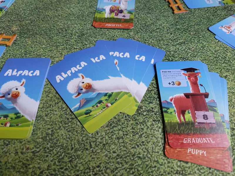 In addition to alpacas, you can purchase end-of-game objective cards that give extra points if you meet certain requirements (e.g., having a certain type of alpaca or a minimum number of enclosures). Timing is key: knowing when to buy and when to purge useless cards makes your deck more fluid and effective.