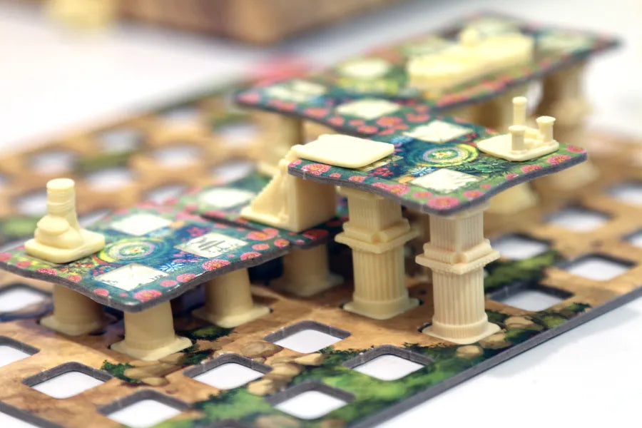 The box itself becomes the quarry, from which you draw Terrace tiles. Each tile you choose provides you with a variable number of columns, essential for supporting and raising the levels of your personal garden. The position of what you take matters: it influences your resources and future moves.