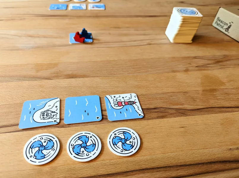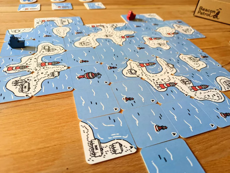 In Lighthouses of the North , players control patrol boats and work together to explore a stretch of sea by placing tiles representing ports, lighthouses, shoals, and safe waters. It's a simple yet strategic cooperative tile-laying board game .