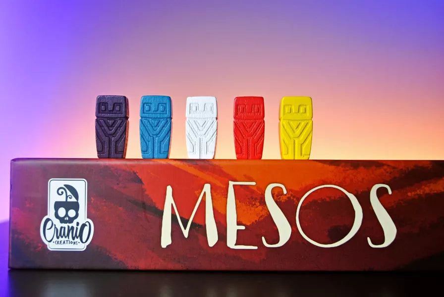 Published by Cranio Creations , Mesos is a board game for 2-5 players , ages 10 and up , with games lasting approximately 30 minutes . Designed by Yaniv Kahana and Simone Luciani , with illustrations by Kerri Aitken , the game puts you in the shoes of a tribal chief in the Mesolithic era. You'll assign roles to your tribe members, construct specialized buildings, and deal with unexpected events, leading your people to prosperity.