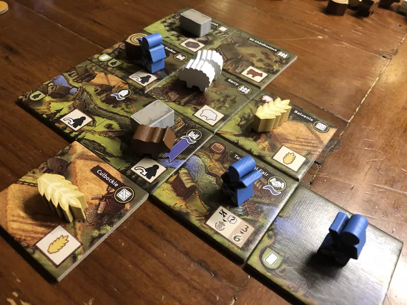 The tiles represent villages, castles, distilleries, pastures, and more. Once placed, they immediately activate themselves and adjacent tiles , generating resources, points, or actions. A compact and synergistic network is key.