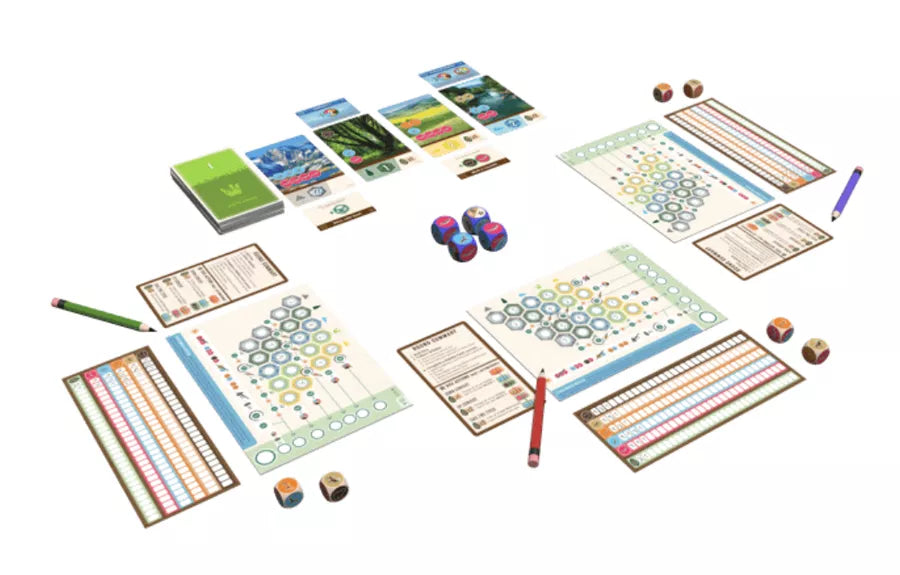 In Cascadia: Rolling Rivers , a roll-and-write board game published by Little Rocket Games , players immerse themselves in creating harmonious ecosystems inspired by the Pacific Northwest. Through dice rolls and environment sheets, each player collects wildlife, completes habitat cards, and uses special actions to manipulate the outcome. With quick play and the option for multiple players, it offers an immersive and ever-changing experience thanks to unique maps and advanced completion cards.