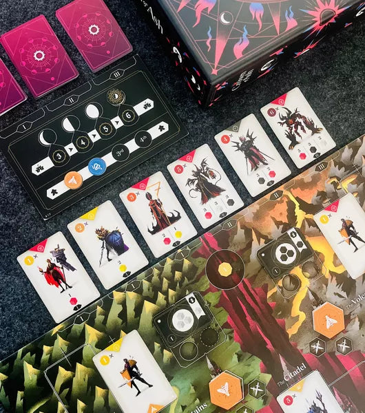 Nel cuore del gioco pulsa un sistema elegante di piazzamento e controllo: invia i tuoi emissari nei luoghi sacri per raccogliere risorse, costruire strutture e far risorgere i tuoi eserciti. Ogni edificio potenzia la tua influenza e apre nuove linee di gioco, ma ogni conquista ti espone all’assalto degli altri Signori. Le battaglie si risolvono con forza militare e bluff, generando scontri tesi e letture sottili del tavolo. Vincere non significa sopravvivere: significa far sì che anche i tuoi nemici servano la tua causa dopo la morte.
