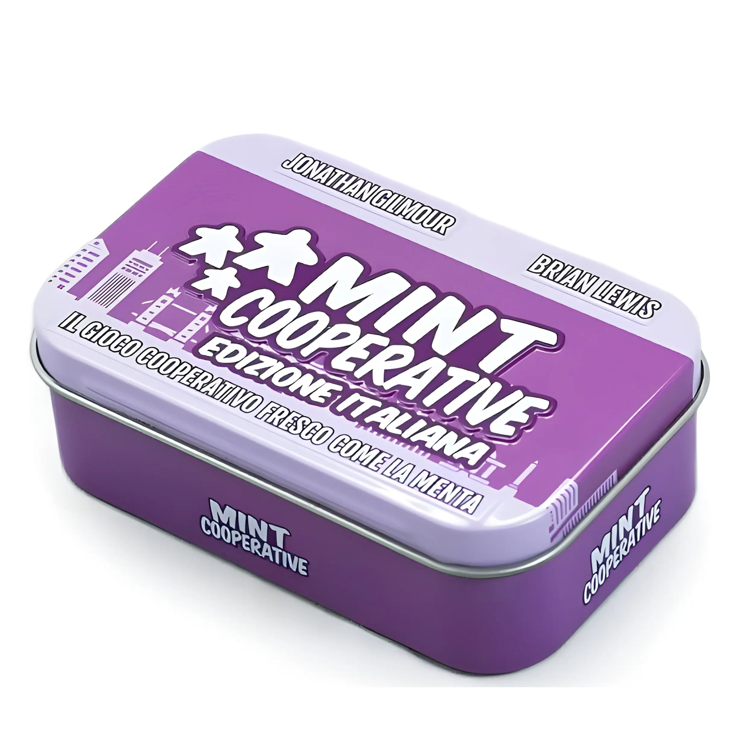 Mint Cooperative continues the popular Mint Series with a new challenge: save Mintopia City and its surrounding towns from the fearsome Bad Breath Domain ! Distributed in Italy by Raven Distribution , this mini-sized cooperative board game combines humor, simplicity, and team spirit in a box the size of a mint can.