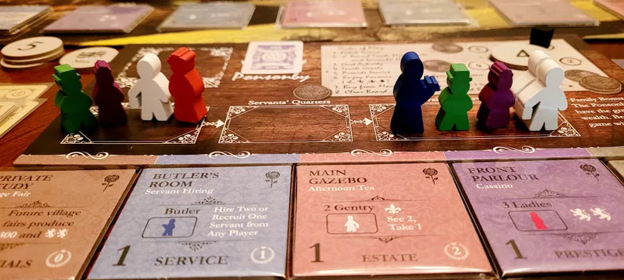 As the turns progress, you'll be able to purchase new rooms and gardens from the central market, expanding the variety of events you can host and increasing your reputation . The benefits you gain allow you to attract higher-ranking guests, expanding your influence in the county.