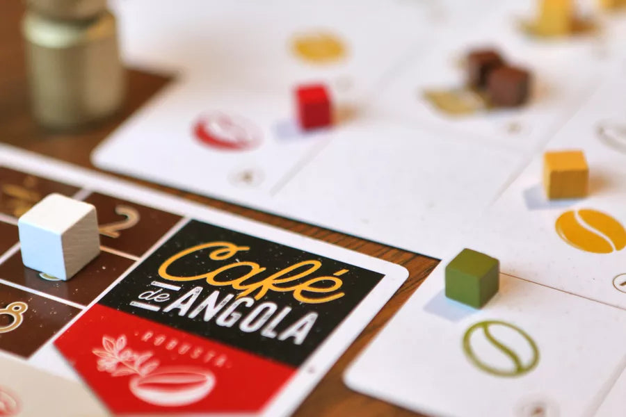 In Café , a management board game published by Djama Games , players take on the role of coffee entrepreneurs in the Portuguese Belle Époque . Through card placement and resource management mechanics, they must grow , dry , roast , and deliver coffee to the finest cafés. With quick gameplay and the option to play alone or in a group, it offers an engaging and strategic experience.