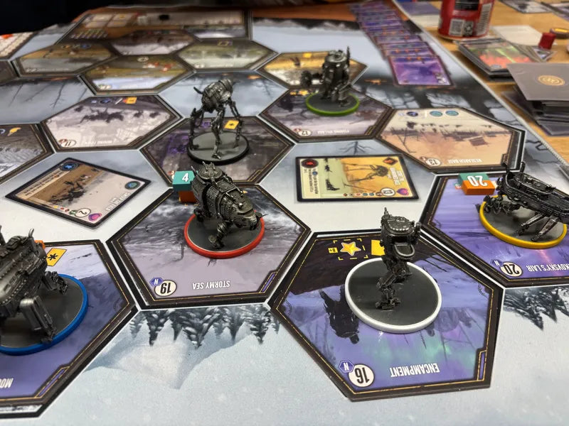 Each turn, you move your mech across the map tiles, revealing unknown locations and collecting new cards representing items, meteorites, workers, and missions. Each area holds opportunities and challenges that can radically transform your strategy.