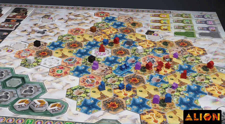The action system relies on the use of keycards to activate action spaces, in a deep and modular engine-building. Actions allow you to expand the map, excavate archaeological sites, build structures, evolve technologies, or discover lost abilities.