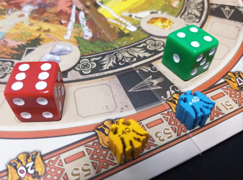 The heart of the game is a wheel with colored dice. Each die represents a resource (wood, stone, gold, etc.). Move a die a number of spaces equal to the number indicated on it, and collect resources from the landing space.