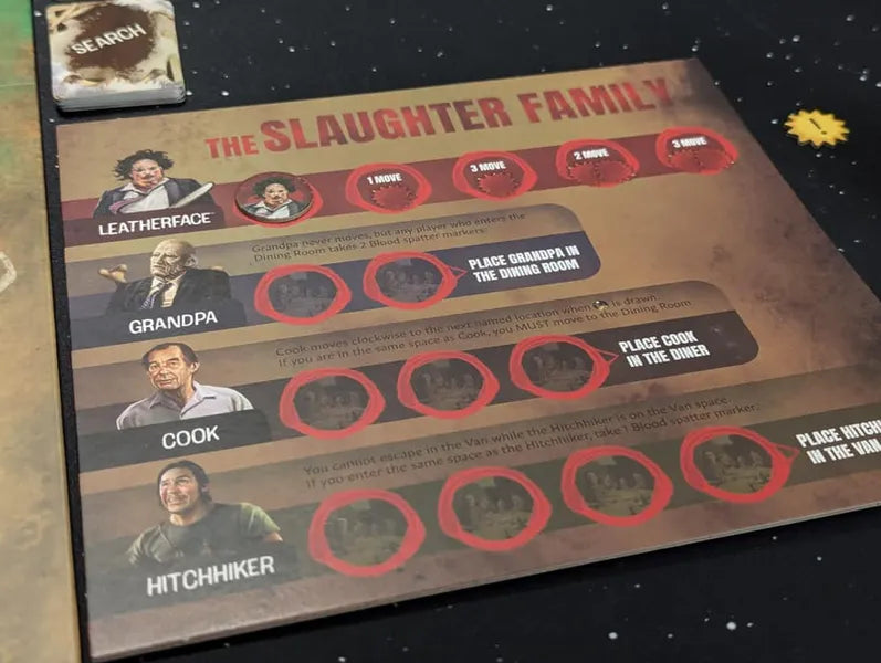 Each turn, you spend actions to flip tokens and search for useful items . But be careful: the more you move, the greater your chances of attracting Leatherface's attention.