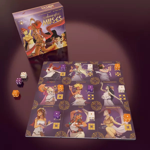 In Dance of Muses sei chiamato a guidare le nove Muse in una danza divina, seguendo i desideri di Apollo. Ogni passo compiuto, ogni movimento sul tabellone fa crescere il valore dei dadi, fino a raggiungere il culmine del rituale. Un gioco astratto rapido e affascinante, in cui logica e colpo d’occhio si intrecciano con un’ambientazione mitologica originale.