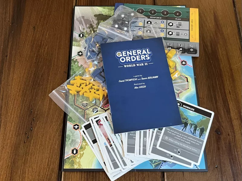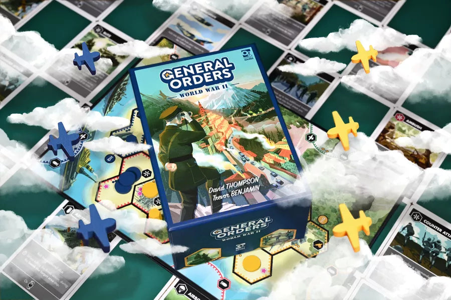 Pubblicato da Ghenos Games, General Orders: World War II è un gioco da tavolo per 2 giocatori, dai 14 anni in su, con partite di circa 30 minuti. Ideato da Trevor Benjamin e David Thompson, con illustrazioni di Alex Green, il gioco combina meccaniche di piazzamento lavoratori e controllo del territorio in un contesto bellico. I giocatori assumono il ruolo di comandanti avversari durante la Seconda Guerra Mondiale, competendo per il controllo di un campo di battaglia cruciale, sia nelle montagne italiane che nelle isole del Pacifico. Ogni decisione è fondamentale: catturare asset strategici, proteggere le linee di rifornimento e difendere il quartier generale sono solo alcune delle sfide da affrontare in questo gioco compatto ed elegante.