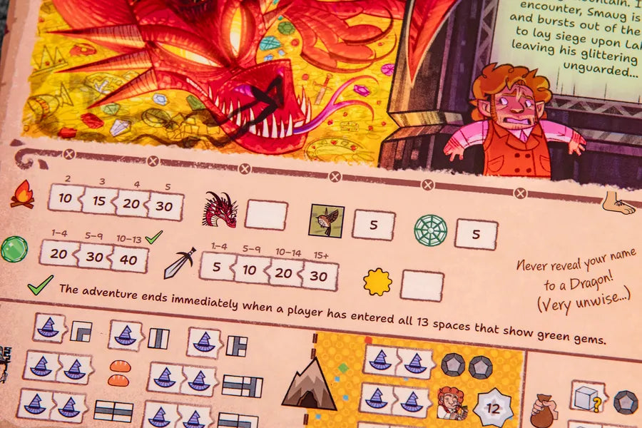 Ogni giocatore ha davanti a sé un libro-plancia cancellabile, aperto sullo stesso capitolo della storia. Il gioco ripercorre gli otto momenti più iconici de Lo Hobbit, dalla fuga dai Troll fino alla sfida con Smaug.