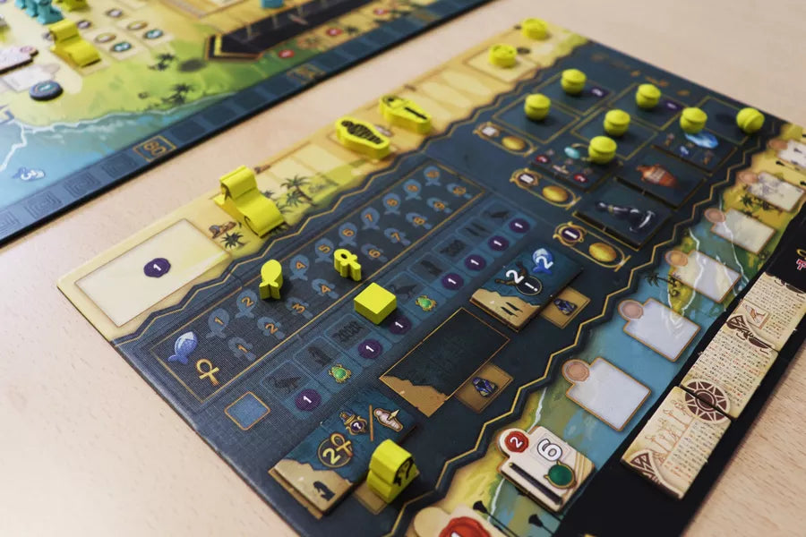 Con un sistema di selezione azioni che fonde piazzamento lavoratori e draft di tessere, ogni mossa conta per ottenere punti prestigio ed essere benedetto da Osiride nell’aldilà.