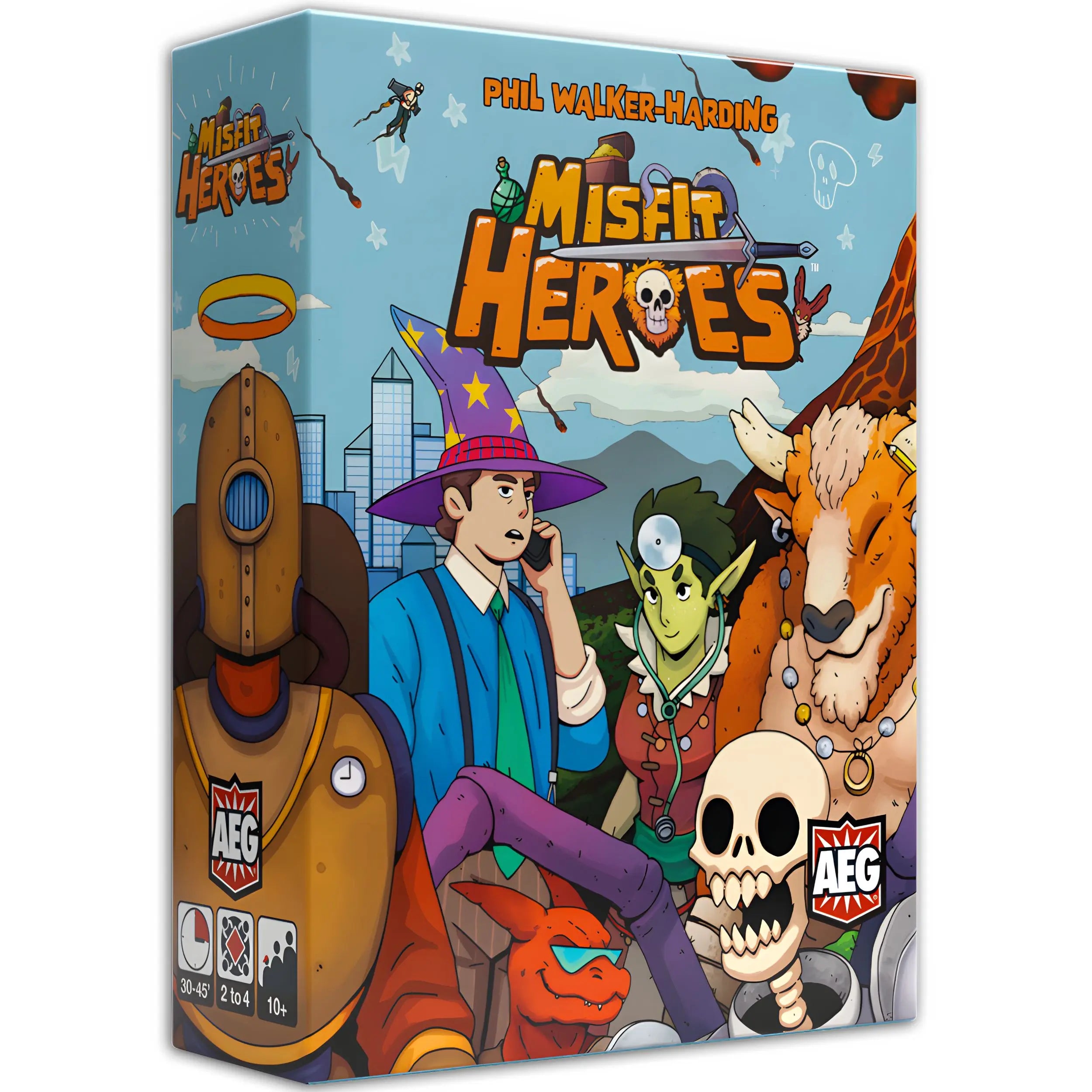 Misfit Heroes è un gioco da tavolo per famiglie (2–4 giocatori, 30–45 minuti) firmato da Phil Walker-Harding e pubblicato da AEG. La sua particolarità è il card crafting con trasparenze: prima della partita, sovrapponi una carta Personaggio e una carta Attributo in una sleeve, creando eroi sempre diversi. Ogni combinazione genera abilità speciali, bonus o azioni economiche come ottenere monete, pescare carte o aumentare l’influenza nelle regioni di gioco.